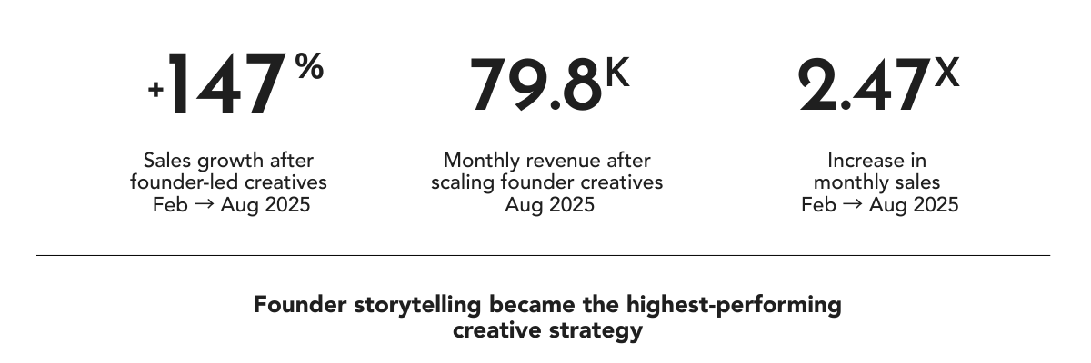 Differentiation through personality: When every competitor has the same type of static image ads, the founder’s face, voice and story became the thing that stopped the scroll.