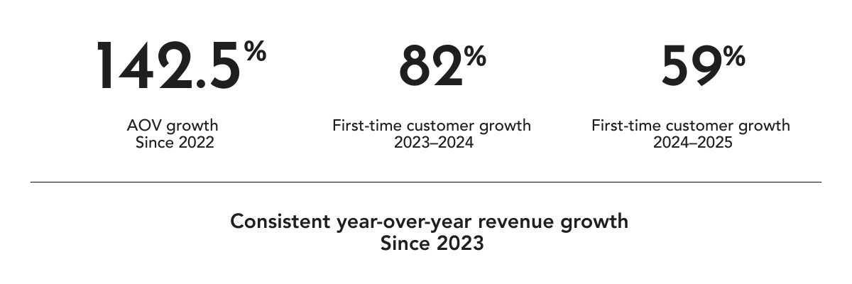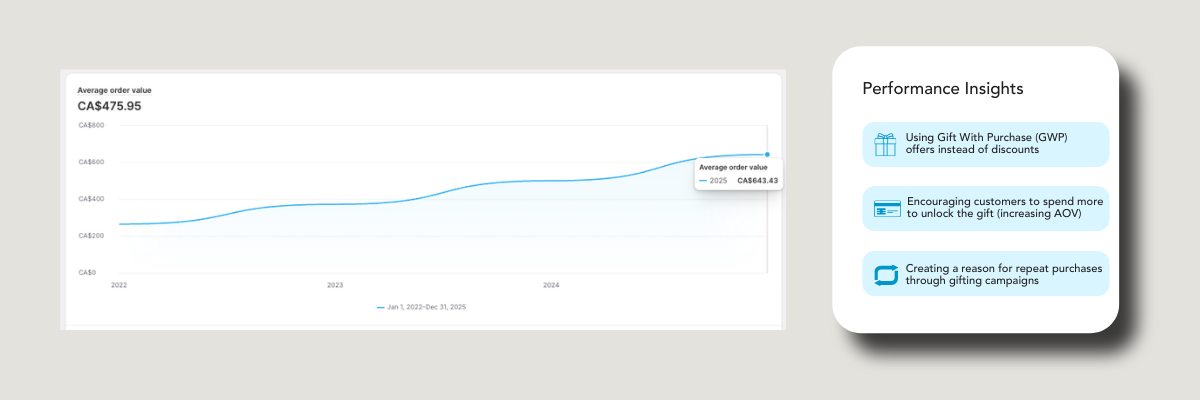 142% AOV Growth Over Three Years: The gift-with-purchase strategy didn't just work, it became the number one offer the brand runs, month over month, including Q4.